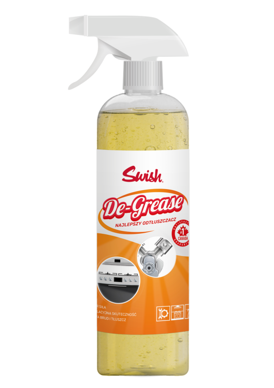 Środek Swish De-Grease charakteryzuje się skoncentrowaną formułą i silnym działaniem, dzięki czemu poradzi sobie nawet z uciążliwymi zabrudzeniami. Preparat jest gotowy do użytku. Przeznaczony jest do mycia ręcznego oraz przemysłowego po bezpośredniej aplikacji środka na zanieczyszczenia. Unikalna formuła sprawia, że Swish De-Grease z powodzeniem poradzi sobie z różnego rodzaju zabrudzeniami, w tym m.in. tłustymi plamami, zabrudzeniami olejowymi, ropopochodnymi, spożywczymi i przemysłowymi. Wykorzystywany jest również do usuwania sadzy, kamienia wodnego oraz innych osadów. W zależności od stopnia zabrudzenia Swish De-Grease aplikuje się bezpośrednio na brud lub na ściereczkę. Następnie czyszczoną powierzchnię należy wytrzeć do sucha.