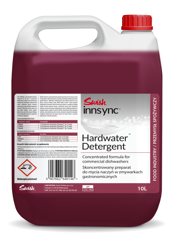 Swish Hardwater Detergent to skoncentrowany płyn do usuwania zabrudzeń z naczyń i sztućców w profesjonalnych zmywarkach gastronomicznych. Świetnie radzi sobie z osadami powstałymi z kawy, herbaty, tłuszczu itd. Jego innowacyjna formuła sprawia, że bez trudu pozwala usunąć nawet problematyczne zabrudzenia. Zawiera składniki aktywne powierzchniowo oraz zmiękczające wodę.